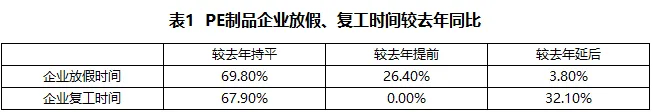 春节作为PE下游制品行业生产经营的重要节点,其假期安排与复工节奏直接反映行业运行态势及企业经营预期。