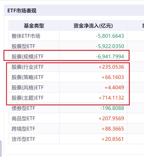 有意思的是,虽然“GJD”在从大盘相关的基金(宽基ETF)里撤,但另一边,瞄准具体行业(比如科技、新能源)的基金(行业主题ETF)昨天却流入了120亿,累计也进了超过1000亿。