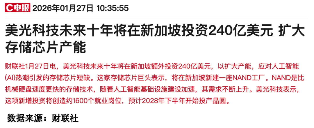 先说说美光那点事儿——这两天他们在新加坡搞了个「大工程」:现有NAND闪存园区里开建先进晶圆厂,十年要砸240亿美元,2028下半年才能投产。而且这厂还是新加坡首个双层晶圆厂,光无尘室就有70万平方英尺。其实美光在新加坡本来就「家底厚」,98%的闪存芯片都在那造,之前还投了70亿建HBM先进封装厂(就是AI芯片要用到的高带宽内存),2027年就能投产。