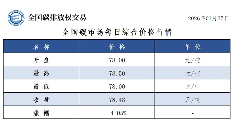 2026年1月1日至1月27日,全国碳市场碳排放配额成交量10,186,817吨,成交额736,108,668.30元。