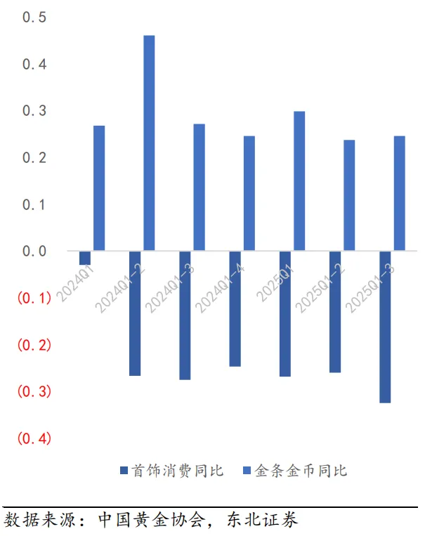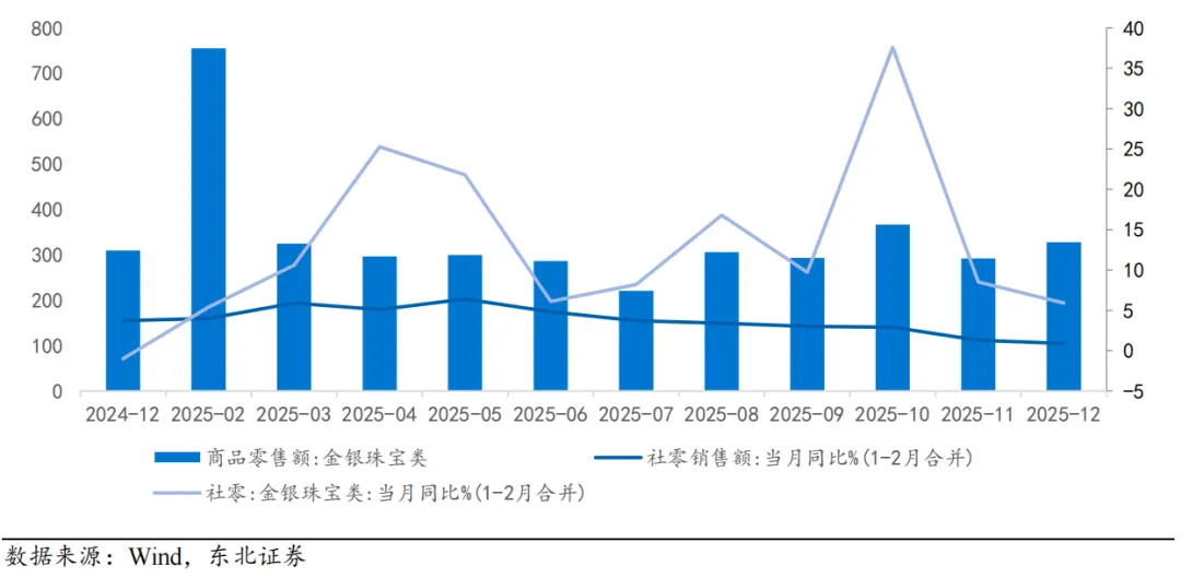 Q4及元旦销售火爆,高金价下行业呈"结构牛"。2025年12月金银珠宝零售额当月同比+5.9%,全年累计同比+12.8%,金价高位带动零售额增长但销量承压,行业呈"价增量弱"格局。前三季度黄金消费结构分化明显:黄金首饰消费量同比-32.50%,金条金币同比+24.55%,投资类品类持续旺盛。首饰端转向轻克重与高附加值产品,定价黄金、高端古法金成为增长新引擎。