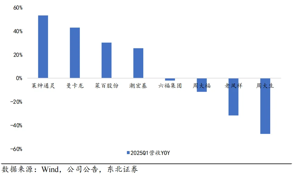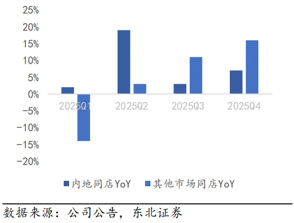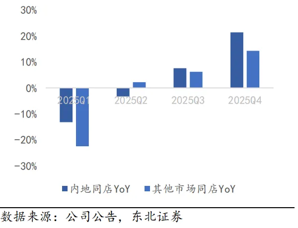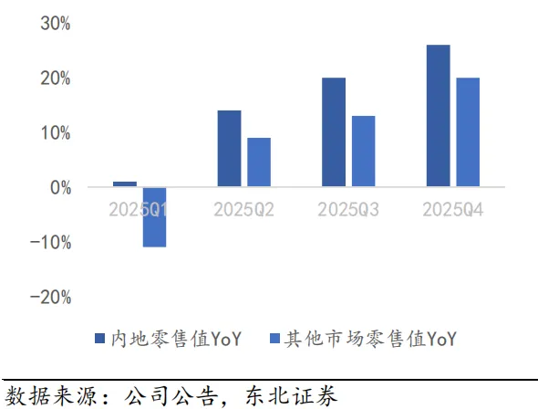 头部品牌呈"年初承压、逐季修复、年末爆发"趋势。周大福内地零售值从Q1负增长逐步转正,其他市场Q4增速突破20%;六福表现类似,港澳及海外市场复苏力度强于内地,年末节日消费带动全渠道增速迎来阶段性高点。