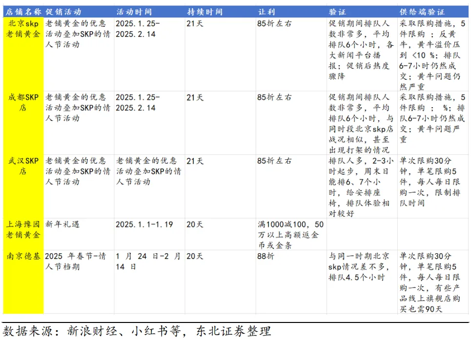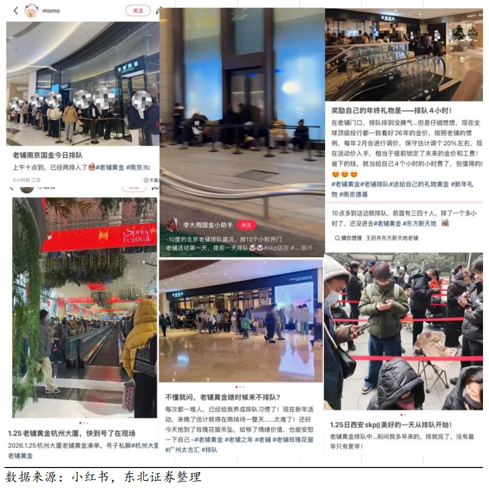 老铺黄金核心门店再现排队潮,为2026年春节动销奠定基础。2025年Q1,北京、成都SKP等核心门店因85折促销引发5-6小时排队,部分时段达8小时,单日发号400-500个,直接带动业绩与股价爆发式增长。2026年元旦至今,品牌启动87.5折等促销活动叠加马年生肖新品上市,南京、杭州等门店再次出现超4小时排队,预计春节期间动销将进一步爆发。
