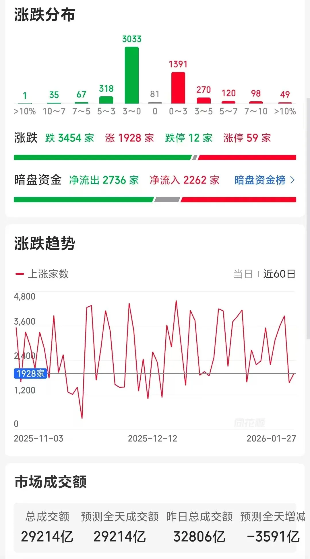 指数早盘跌的不太大,但是白线黄线分的有点大,大部分时间下跌个股都在4000家以上。指数还是红的~~~~太分裂了。