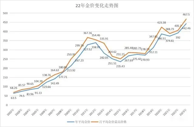 本以为400元/克的价格顶天了,谁知道2023年飙到了470元,到今年3月,黄金价格甚至一度突破500元大关。