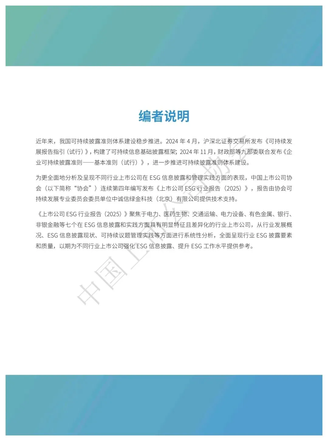 《2025中国上市公司ESG行业报告》由中国上市公司协会编写、中诚信绿金科技提供技术支持,聚焦电力、医药生物、交通运输等七个重点行业,系统分析了上市公司ESG信息披露与管理实践现状,为行业可持续发展提供参考。