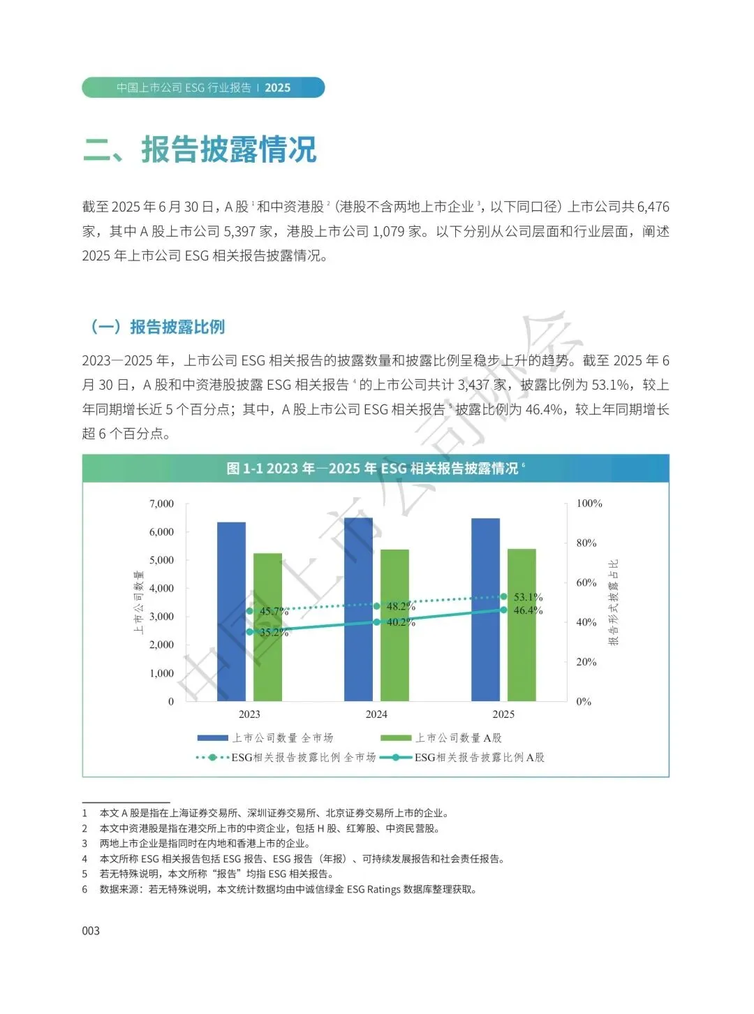截至2025年6月30日,A股和中资港股上市公司共6476家,3437家披露ESG相关报告,披露比例达53.1%,较上年增长近5个百分点。各行业披露水平全面提升,13个行业披露率突破60%,银行业和非银金融业以100%和92.7%的披露率位居前列,披露率超50%的行业增至22个。
