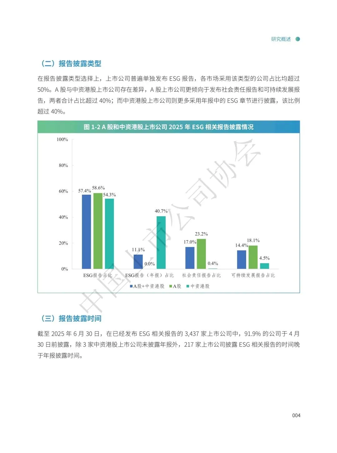 在披露类型上,上市公司普遍偏好单独发布ESG报告,A股更倾向于发布社会责任报告和可持续发展报告,中资港股则多采用年报ESG章节披露模式;91.9%的披露公司于4月30日前完成报告发布。