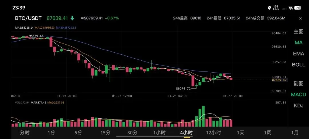 2026年1月27日比特币行情分析4小时K线图(显示价格约87,639美元)和2026年1月27日市场数据,比特币当日呈现技术性反弹后的震荡整理格局,价格在86,000-89,000美元区间内反复测试支撑阻力,整体仍处于弱势调整阶段。以下是当日行情的关键分析要点: