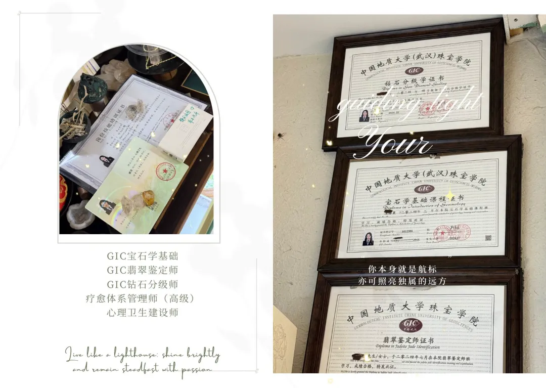 拿下GIC钻石分级师、翡翠鉴定师双证,掌握专业的鉴定技巧;研究矿物学特征,能一眼区分紫龙晶和舒俱来、天然水晶和合成水晶。