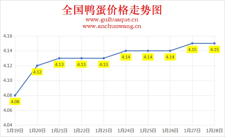 2026年1月28日全国鸭蛋价格行情快递:稳定为主,今日全国鸭蛋均价4.15元/斤。