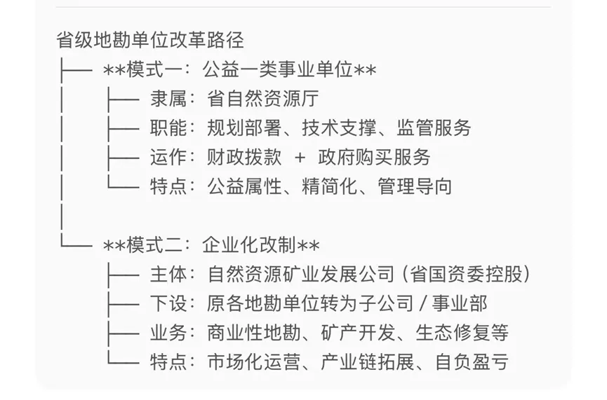 贵州模式:“一局一院”,公益与商业分离。初衷是清晰的,但现实中:公益队伍如果经费不足,技术能力如何保持?商业队伍如果只看利润,谁来做那些不赚钱却关乎国家安全的战略勘查?