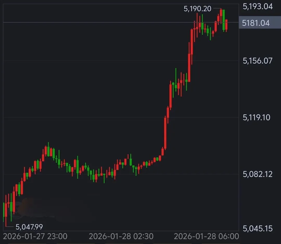 国际市场上,伦敦金现5181.04美元/盎司,较昨日涨136.26美元,涨幅2.70%,创历史新高,地缘冲突升级与美元信用担忧持续推升避险需求。