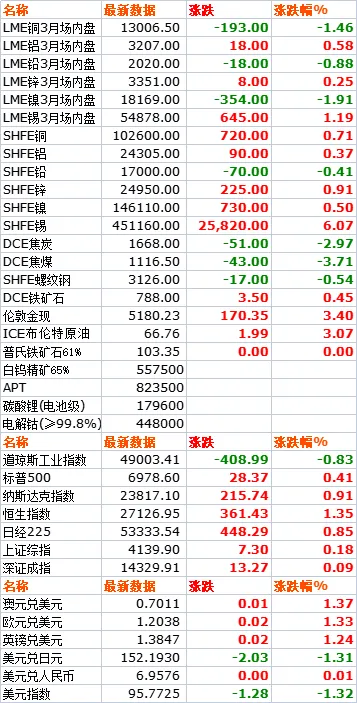 1月27日,LME六种基本金属价格涨跌互现。三月期铜价收于13006.5美元/吨,下跌1.46%。三月期铝价收于3207美元/吨,上涨0.58%。三月期铅价收于2020美元/吨,下跌0.88%。三月期锌价收于3351美元/吨,上涨0.25%。三月期锡价收于54878美元/吨,上涨1.19%。三月期镍价收于18169美元/吨,下跌1.91%。