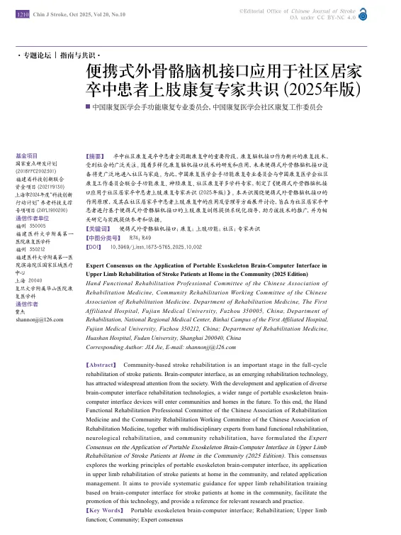 前言:中国康复医学会手功能康复专业委员会,联合社区康复工作委员会发布《便携式外骨骼脑机接口应用于社区居家卒中患者上肢康复专家共识(2025 年版)》,这也是国内针对便携式外骨骼脑机接口,在社区与家庭场景中系统化应用的指南。