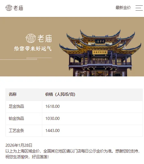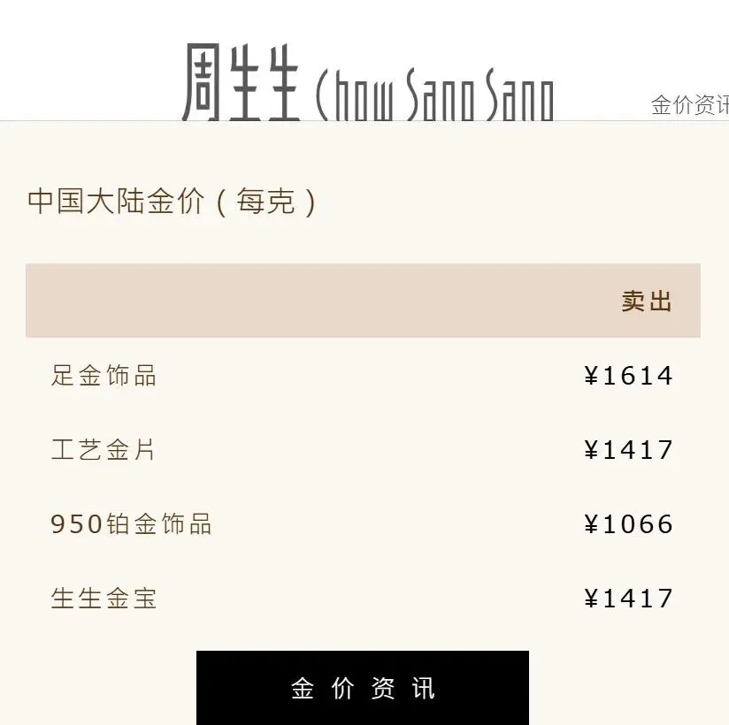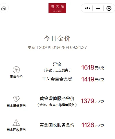 记者查询发现,已有多家国内黄金品牌的金饰报价突破1600元/克。其中,周大福报价1618元/克,周生生报价1614元/克,老凤祥报价1620元/克,老庙黄金报价1618元/克。