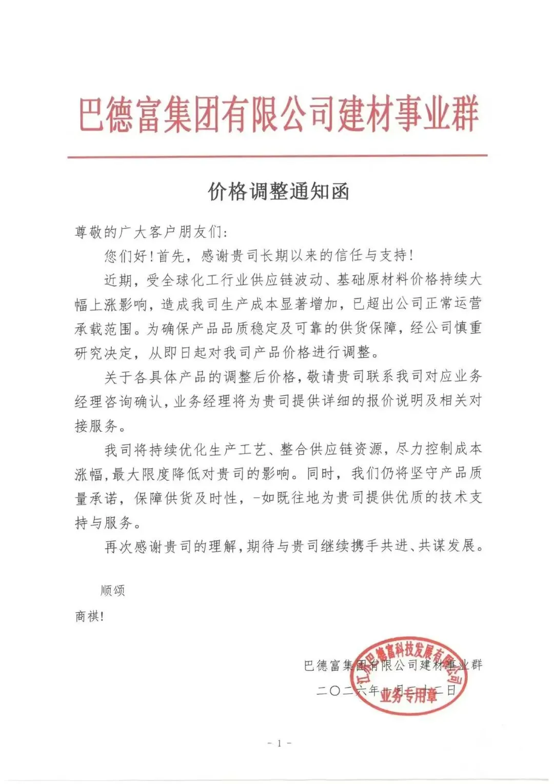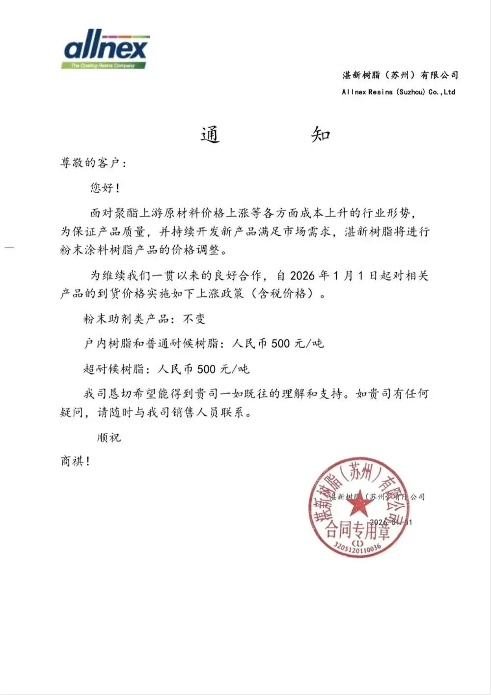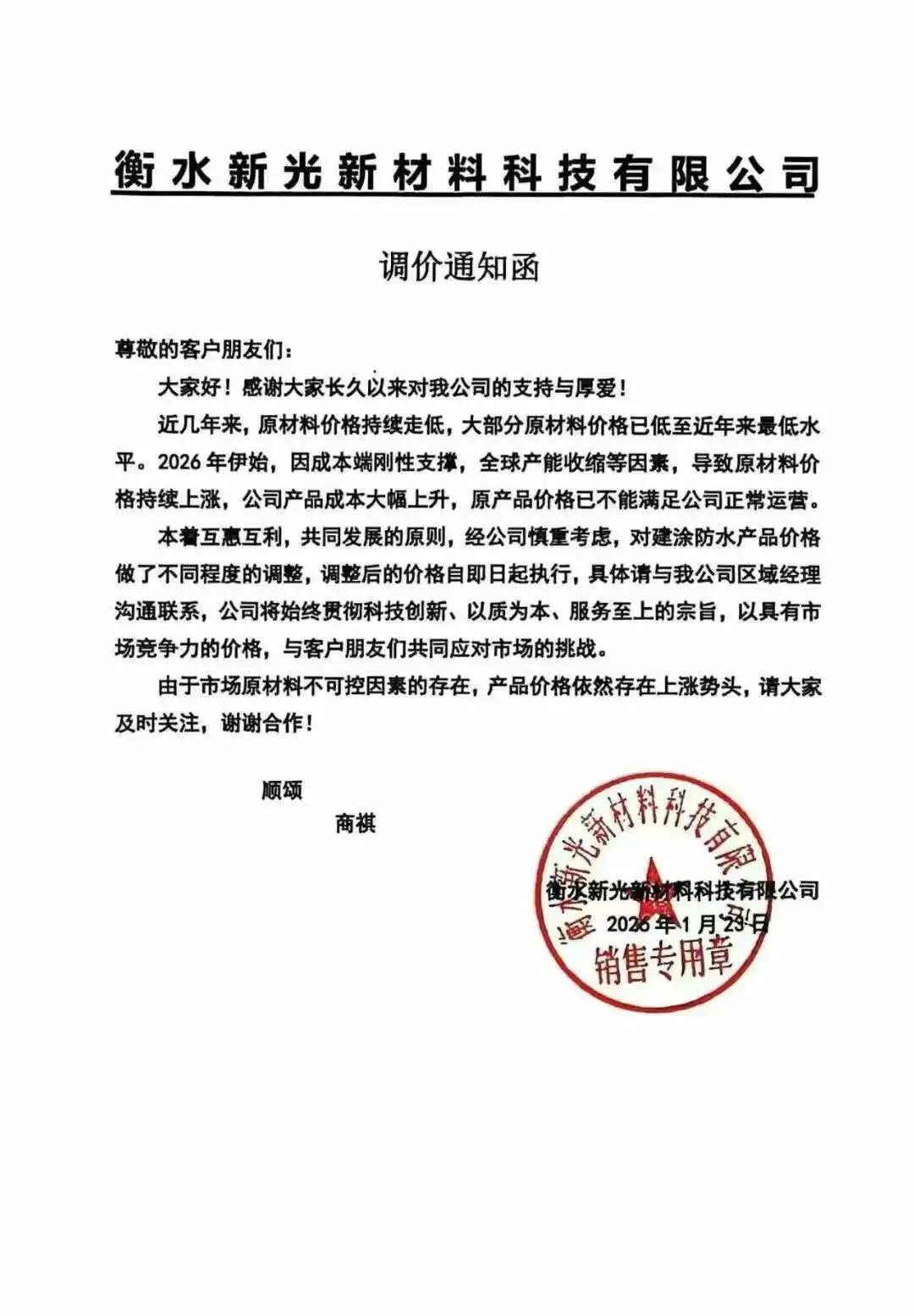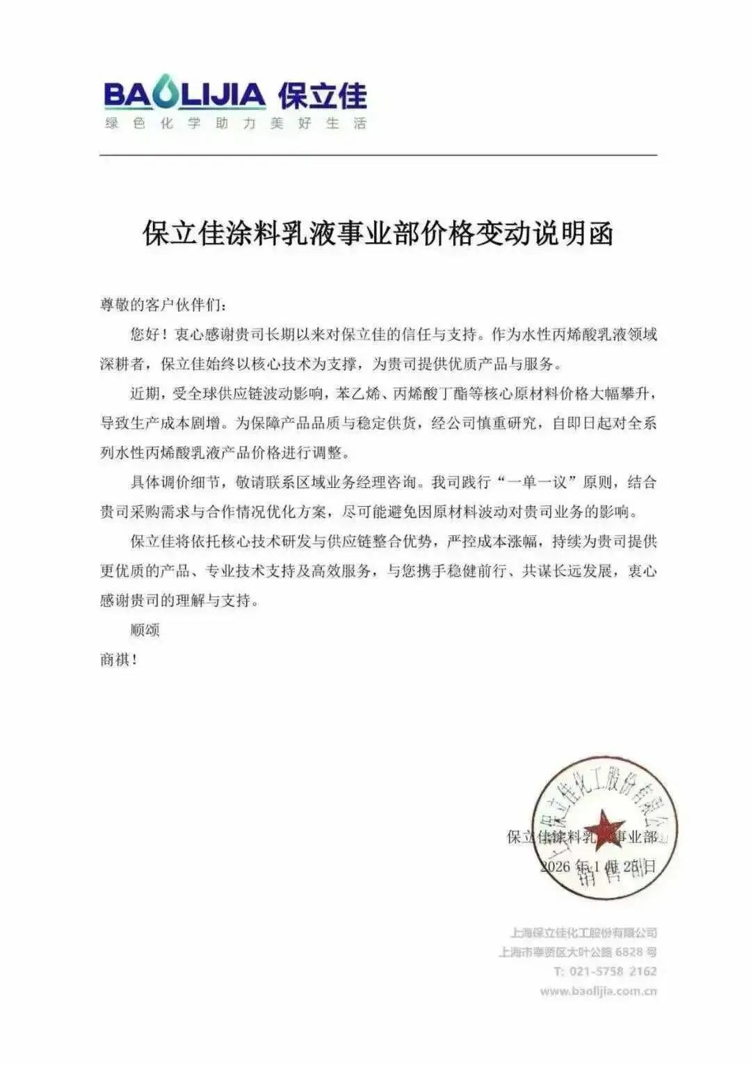 ☝点击上方“化工技术宝典”关注公众号,看更多精彩内容!近日,乳液龙头企业保立佳发布价格变动说明函,称受全球供应链波动影响,核心原材料价格大幅攀升,导致生产成本剧增。经慎重研究,自即日起对全系列水性丙烯酸乳液产品价格进行调整,并践行“一单一议”原则。值得注意的是,近期乳液行业的涨价潮已经势不可挡。广东恒和永盛集团以《温馨提示函》告知客户,受苯乙烯、丙烯酸丁酯等关键原材料价格持续暴涨影响,生产成本大幅攀升,为维系正常运营与长期合作,后续订单将采用“一单一议”模式灵活定价,本质是通过动态调价规避成本波动风险。衡水新光新材料科技的调价逻辑更具行业普遍性,其提及此前数年原材料价格持续探底至近年低位,2026年初却受成本端刚性支撑、全球产能收缩等因素逆势上涨,原售价已无法覆盖运营成本,只得对建涂防水类乳液产品调价,同时预警价格仍有上行空间。行业龙头巴德富集团表示,受全球化工行业供应链波动、基础原材料价格持续大幅上涨影响,生产成本显著增加,即日起对产品价格进行调整。佛山罗斯夫科技也表示,原材料价格不断上涨,苯乙烯市场价对比上月同期上涨约1000元/吨,丁酯市场价对比上月同期上涨约400元/吨,异辛酯市场价对比上月同期上涨约900元/吨,企业订单具体以实单友好商谈为主。国内多个乳液龙头企业的集体发声,态度坚决且诉求明确。行业内多家中小型乳液厂商在内部渠道坦言“已难以承受亏损接单”,生存压力持续加剧。分析人士指出,此番乳液原料跳涨,与国际原油走势、国内“双控”政策趋严及春节前备货需求集中释放密切相关,多重因素叠加形成成本重压。受上游原材料涨价驱动,多家颜料企业跟进调整售价,聚焦核心产品精准传导成本压力。双乐颜料明确因苯酐、铜价上涨,对酞菁系列颜料产品每吨上调1000元,直接对应上游原料成本增幅。另有颜料企业针对性调整细分品类价格,将酞菁蓝15:0系列、酞菁绿系列产品在原价基础上每公斤上调0.5元,同时为维系核心合作关系,对重点客户保留“一单一议”的弹性空间,在成本回收与客户留存间寻求平衡。钛白粉领域,攀枝花市钛海科技发布涨价函,称受原材料价格高企及国内外市场行情影响,即日起对金红石型、锐钛型钛白粉同步提价,国内客户每吨上调500元,国外客户每吨上调70美元。树脂领域呈现龙头企业协同涨价态势,聚酯树脂赛道尤为明显。湛新树脂、擎天材料科技、安徽智成实业等行业龙头,均同步宣布自2026年1月1日起,对旗下相关树脂产品每吨上调500元。擎天材料科技与安徽智成实业在调价公告中均明确,涨价核心诱因是上游PTA、新戊二醇等原料价格持续暴涨,导致生产成本激增,调价是迫于成本压力的无奈之举,也体现了行业龙头对成本传导的一致态度,进一步强化了树脂品类的涨价预期。除上述核心品类外,多款基础化工原料同步迎来涨价,供需格局成为核心驱动因素。丁二烯市场表现抢眼,自年初以来,华东市场丁二烯价格累计上涨1450元/吨,市场价格已攀升至9650元/吨附近。市场监测显示,包括恒力石化、卫星化学在内的多家头部生产企业在一周内两度上调报价,单次提价幅度最高达550元/吨。此外,助剂龙头毕克化学(BYK)宣布自2月1日起上调助剂产品价格5.2%,其将原因指向人力、供应链及合规挑战,反映出订单冷淡期化工原料的多元成本压力。面对上游原料的全面涨价,涂料行业不再被动承受,而是通过提价传导、模式调整、资本联动等多重方式主动反击,筑牢经营底线。头部企业率先打破僵局,三棵树发布《硅酮胶产品调价通知函》,宣布自2月1日起,全系列硅酮胶产品价格上调5%-10%,同时在调价过渡期实行限量接单,保留随时再次调价或停止接单的权利。资本市场迅速响应,其股价在1月19日至21日三个交易日内累计涨幅超20%,印证了市场对企业成本转嫁能力的认可。科顺股份紧随其后精准反击,于1月20日针对性调整苯丙体系防水产品价格,因丙烯酸酯乳液等核心原料涨价导致成本剧增,决定自2月1日起对KS-988A、KS-906等产品涨价5%-10%,同期股价累计涨幅近10%,与三棵树形成呼应,彰显头部企业的定价主导权。在模式调整层面,行业掀起反赊销、强现金流的变革浪潮,从根源上缓解资金压力。阿尔法新材料总裁卫向阳公开表态,明确提出“年底欠款不结,来年一概不赊账”,直击行业“利润见底、产量萎缩、回款艰难”的痛点,拒绝为下游垫资承担额外成本,倒逼客户结清账款,推动行业摒弃畸形赊销模式,回归健康资金流转轨道。此外,涂料企业在涨价节奏上展现差异化反击策略。中涂化工率先打响涂料制品涨价第一枪,自1月起分批上调售价,核心船底防污涂料系列涨幅高达20%-30%,避免全行业陷入“亏损接单”的恶性竞争。不难发现,从涂料到化工的涨势已经迅速蔓延,这背后并非单一因素作用,而是原材料成本、地缘政治冲突、进出口成本增加及资金链危机多重叠加的必然结果。其中原材料成本攀升是核心诱因,原油作为“化工之母”,价格波动直接传导至苯乙烯、PTA、苯酐等上下游原料,叠加国内“双控”政策趋严、环保合规成本上升压缩产能,形成刚性成本压力,倒逼乳液、树脂、颜料等各品类陆续提价。地缘政治冲突风险进一步加剧波动,国际局势动荡引发原油供给担忧,叠加海外供应链扰动,推高全球化工原料基础成本,