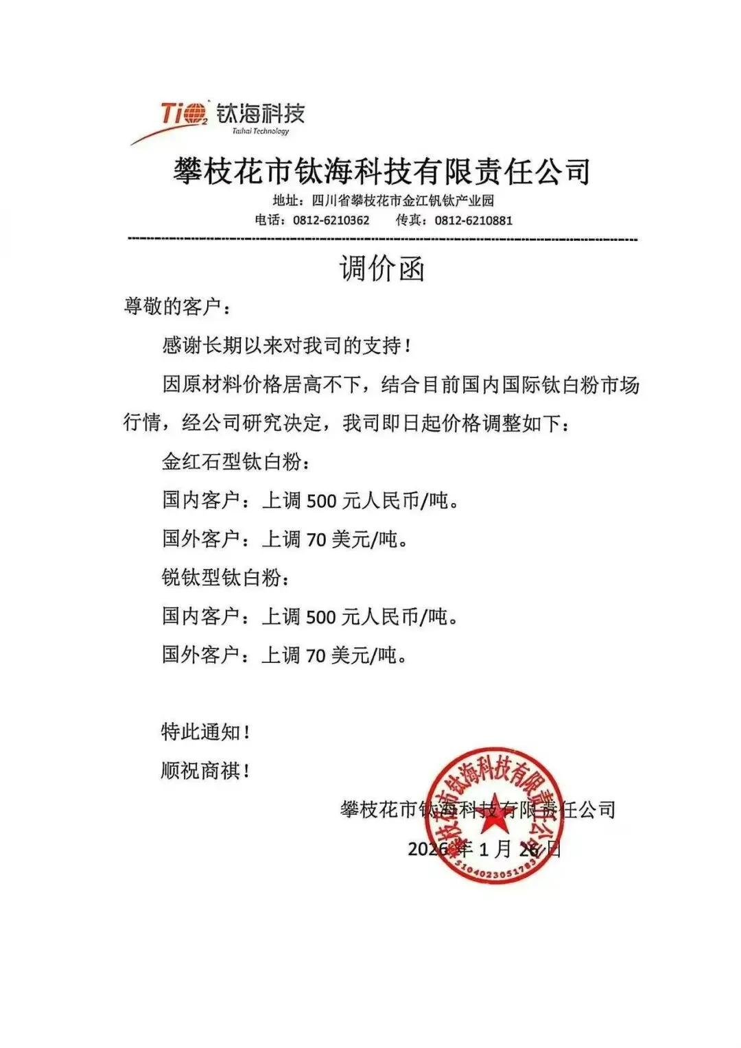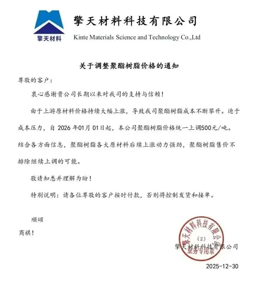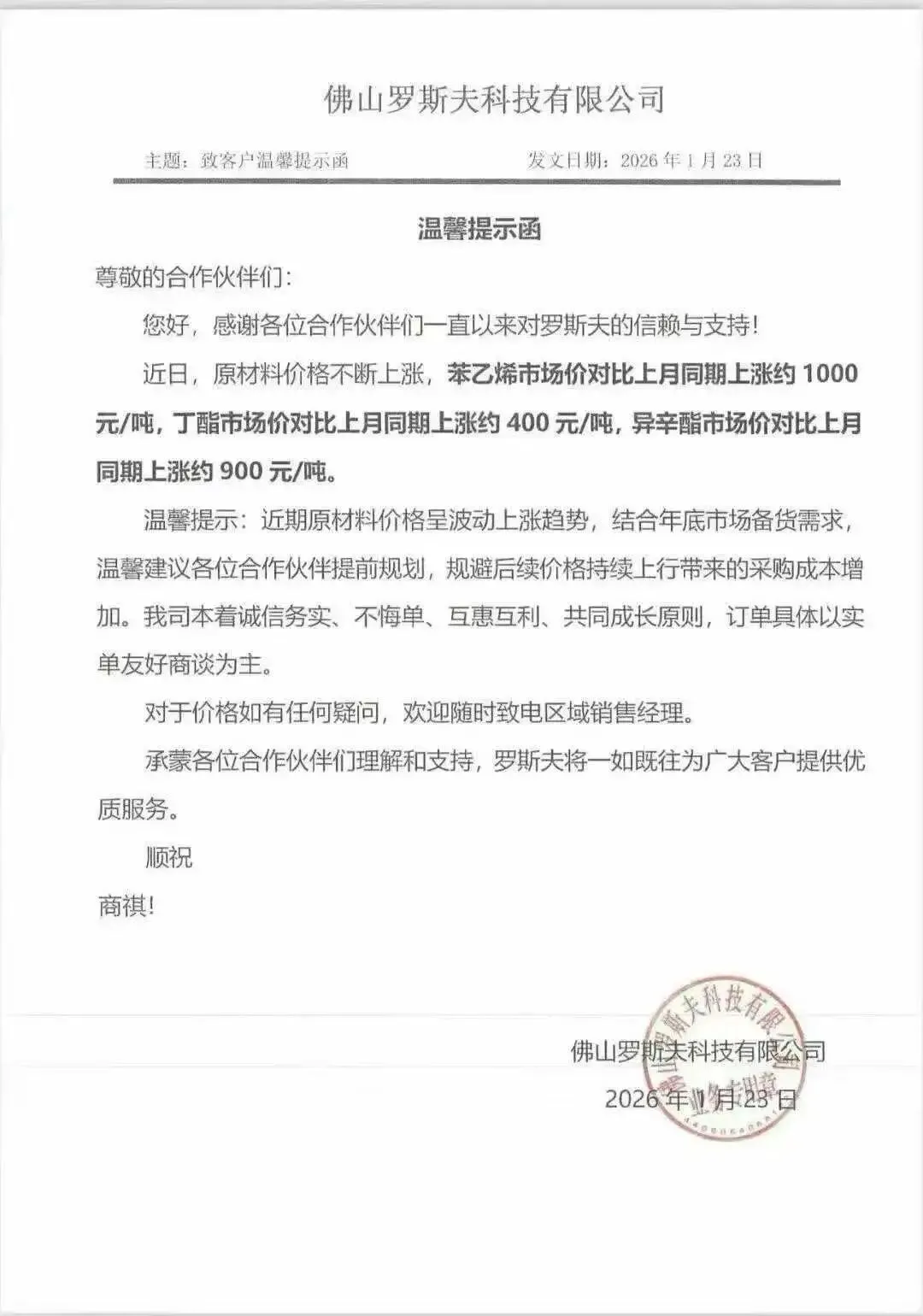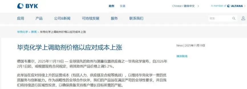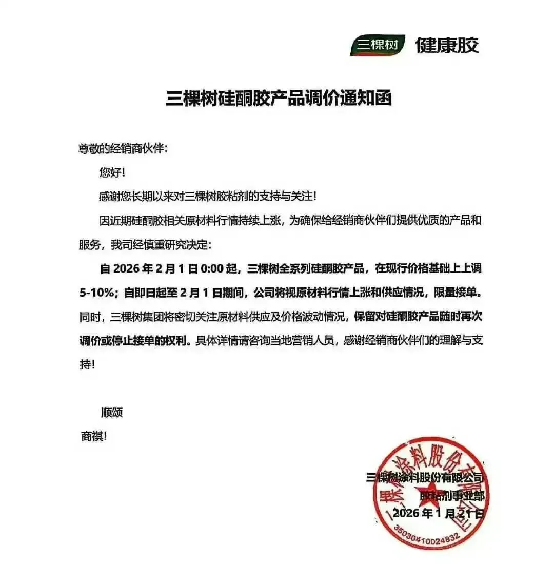 ☝点击上方“化工技术宝典”关注公众号,看更多精彩内容!近日,乳液龙头企业保立佳发布价格变动说明函,称受全球供应链波动影响,核心原材料价格大幅攀升,导致生产成本剧增。经慎重研究,自即日起对全系列水性丙烯酸乳液产品价格进行调整,并践行“一单一议”原则。值得注意的是,近期乳液行业的涨价潮已经势不可挡。广东恒和永盛集团以《温馨提示函》告知客户,受苯乙烯、丙烯酸丁酯等关键原材料价格持续暴涨影响,生产成本大幅攀升,为维系正常运营与长期合作,后续订单将采用“一单一议”模式灵活定价,本质是通过动态调价规避成本波动风险。衡水新光新材料科技的调价逻辑更具行业普遍性,其提及此前数年原材料价格持续探底至近年低位,2026年初却受成本端刚性支撑、全球产能收缩等因素逆势上涨,原售价已无法覆盖运营成本,只得对建涂防水类乳液产品调价,同时预警价格仍有上行空间。行业龙头巴德富集团表示,受全球化工行业供应链波动、基础原材料价格持续大幅上涨影响,生产成本显著增加,即日起对产品价格进行调整。佛山罗斯夫科技也表示,原材料价格不断上涨,苯乙烯市场价对比上月同期上涨约1000元/吨,丁酯市场价对比上月同期上涨约400元/吨,异辛酯市场价对比上月同期上涨约900元/吨,企业订单具体以实单友好商谈为主。国内多个乳液龙头企业的集体发声,态度坚决且诉求明确。行业内多家中小型乳液厂商在内部渠道坦言“已难以承受亏损接单”,生存压力持续加剧。分析人士指出,此番乳液原料跳涨,与国际原油走势、国内“双控”政策趋严及春节前备货需求集中释放密切相关,多重因素叠加形成成本重压。受上游原材料涨价驱动,多家颜料企业跟进调整售价,聚焦核心产品精准传导成本压力。双乐颜料明确因苯酐、铜价上涨,对酞菁系列颜料产品每吨上调1000元,直接对应上游原料成本增幅。另有颜料企业针对性调整细分品类价格,将酞菁蓝15:0系列、酞菁绿系列产品在原价基础上每公斤上调0.5元,同时为维系核心合作关系,对重点客户保留“一单一议”的弹性空间,在成本回收与客户留存间寻求平衡。钛白粉领域,攀枝花市钛海科技发布涨价函,称受原材料价格高企及国内外市场行情影响,即日起对金红石型、锐钛型钛白粉同步提价,国内客户每吨上调500元,国外客户每吨上调70美元。树脂领域呈现龙头企业协同涨价态势,聚酯树脂赛道尤为明显。湛新树脂、擎天材料科技、安徽智成实业等行业龙头,均同步宣布自2026年1月1日起,对旗下相关树脂产品每吨上调500元。擎天材料科技与安徽智成实业在调价公告中均明确,涨价核心诱因是上游PTA、新戊二醇等原料价格持续暴涨,导致生产成本激增,调价是迫于成本压力的无奈之举,也体现了行业龙头对成本传导的一致态度,进一步强化了树脂品类的涨价预期。除上述核心品类外,多款基础化工原料同步迎来涨价,供需格局成为核心驱动因素。丁二烯市场表现抢眼,自年初以来,华东市场丁二烯价格累计上涨1450元/吨,市场价格已攀升至9650元/吨附近。市场监测显示,包括恒力石化、卫星化学在内的多家头部生产企业在一周内两度上调报价,单次提价幅度最高达550元/吨。此外,助剂龙头毕克化学(BYK)宣布自2月1日起上调助剂产品价格5.2%,其将原因指向人力、供应链及合规挑战,反映出订单冷淡期化工原料的多元成本压力。面对上游原料的全面涨价,涂料行业不再被动承受,而是通过提价传导、模式调整、资本联动等多重方式主动反击,筑牢经营底线。头部企业率先打破僵局,三棵树发布《硅酮胶产品调价通知函》,宣布自2月1日起,全系列硅酮胶产品价格上调5%-10%,同时在调价过渡期实行限量接单,保留随时再次调价或停止接单的权利。资本市场迅速响应,其股价在1月19日至21日三个交易日内累计涨幅超20%,印证了市场对企业成本转嫁能力的认可。科顺股份紧随其后精准反击,于1月20日针对性调整苯丙体系防水产品价格,因丙烯酸酯乳液等核心原料涨价导致成本剧增,决定自2月1日起对KS-988A、KS-906等产品涨价5%-10%,同期股价累计涨幅近10%,与三棵树形成呼应,彰显头部企业的定价主导权。在模式调整层面,行业掀起反赊销、强现金流的变革浪潮,从根源上缓解资金压力。阿尔法新材料总裁卫向阳公开表态,明确提出“年底欠款不结,来年一概不赊账”,直击行业“利润见底、产量萎缩、回款艰难”的痛点,拒绝为下游垫资承担额外成本,倒逼客户结清账款,推动行业摒弃畸形赊销模式,回归健康资金流转轨道。此外,涂料企业在涨价节奏上展现差异化反击策略。中涂化工率先打响涂料制品涨价第一枪,自1月起分批上调售价,核心船底防污涂料系列涨幅高达20%-30%,避免全行业陷入“亏损接单”的恶性竞争。不难发现,从涂料到化工的涨势已经迅速蔓延,这背后并非单一因素作用,而是原材料成本、地缘政治冲突、进出口成本增加及资金链危机多重叠加的必然结果。其中原材料成本攀升是核心诱因,原油作为“化工之母”,价格波动直接传导至苯乙烯、PTA、苯酐等上下游原料,叠加国内“双控”政策趋严、环保合规成本上升压缩产能,形成刚性成本压力,倒逼乳液、树脂、颜料等各品类陆续提价。地缘政治冲突风险进一步加剧波动,国际局势动荡引发原油供给担忧,叠加海外供应链扰动,推高全球化工原料基础成本,