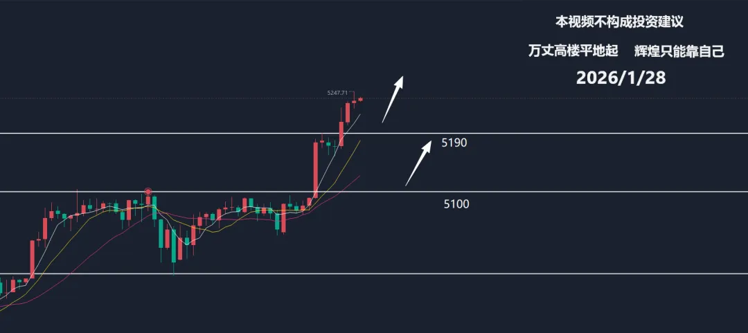 大家好,我是指尖,黄金每天都在创新高,不管你现在的想法如何,黄金都是全球第一大货币,我们昨天会员也从早到晚提醒4990位置就是多空分水岭,不破则继续上涨不变,包括在过去的一段时间内都是持续看涨向上的,没有任何做空的想法。现在全球的央行跟对冲基金公司都在配置黄金,今年真有可能去到6000美元以上。今晚最重要的会议是美联储利率决议以及美联储主席鲍威尔讲话,利率决议预计是维持利率不变,保持在2.7%通胀附近徘徊。这说明鲍威尔的说辞可能不太重要了,但是如果说了不该说的很可能引发市场巨大波动。现在小特已经准备好了下一任美联储主席是谁,就是等待公布的时候。黄金早上就已经上涨突破了5200关口,每天都在持续上涨当中,所以千万不要去做空,也不要锁仓等操作,只需要回调后做多即可,不要追涨追高操作,只要回调就是补仓或者加仓的机会,顺势而行,控制好仓位,这样每周都能收获不错的收益,现在就是长线的朋友只需要做时间的朋友就行。从1小时图来看,黄金目前有两组支撑位是需要今天关注的,第一个是5190位置,第二个就是5100顶底转换位置,不要看现在涨的那么高,很有可能午间或者晚间就大幅度回调下来之后再重新上涨,一般早上飞的越高,基本就是把全天的涨幅都上涨完了,然后晚间V形反转向上而行。历史经常在重演,就看自己能不能把持住,有没有耐心等待了。涨肯定是会涨的,就是看自己有没有耐心。所以综上所述:黄金今天以5190或者5100两组支撑位看涨,上方目标看5300以及5500美金。免责条款:市场有风险,投资需谨慎。本文内容不构成个人投资建议,也未考虑到不同读者的个人财务状况和投资诉求,仅记录作者个人观点及看法,据此投资,责任自负。