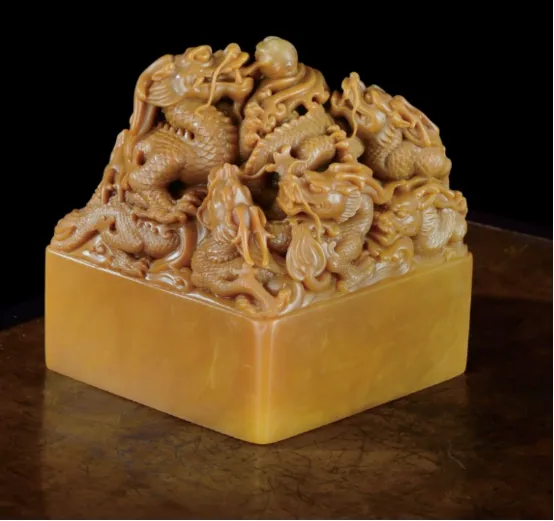 顶级田黄凭借稀缺性、历史传承与文化内涵,成为市场“硬通货”。截止到2026年1月,田黃的拍賣最高記錄為壽山田黃石 “九龍戲珠”在2024年12月3日的拍卖中以9500万元落槌,加上佣金后总成交价达1.0925亿元人民币,成为目前公开数据中田黄拍卖的最高纪录。創下世界田黃拍賣最高記錄,这件田黄九龙玺为当代已知的最大田黄玺印,不仅体量硕大,方章成材,兼且质地温润凝腻,萝卜丝纹清晰,而其浓郁的色泽,隐隐有皇家之气。印证了田黄仍受大藏家追捧。