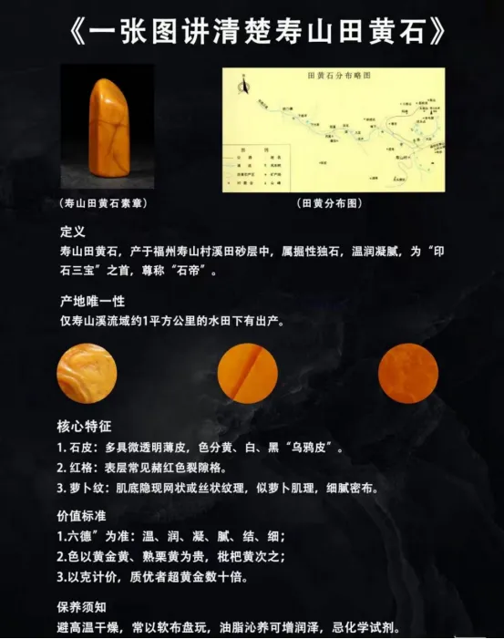 自明清以來便被印人奉為「印石之王」。許多達官顯貴、文人雅士競相搜羅田黃石。因其具「福」(福建)、「壽」(壽山)、「田」(財富)、「黃」(皇帝御用色)的寓意,故稱為「帝石」,清初時期皇帝祭天,神案上必擺一方上品田黃石,因此一直聲名不衰,身價倍增。