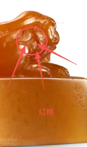 紅筋格是田黃母礦從山上滾落到水田過程中,期間不斷碰撞產生的裂格,後來受溪水與田土中鐵礦物元素的沁染充填所形成的鐵銹色紅紋。大多數的田黃都會有清晰紅筋格,故有無格不成田之說。然而筋格畢竟是弊端,無箭無格的田黃當然是完美的。在這裡我們只能說紅筋格是檢驗田黃石的一個側面。