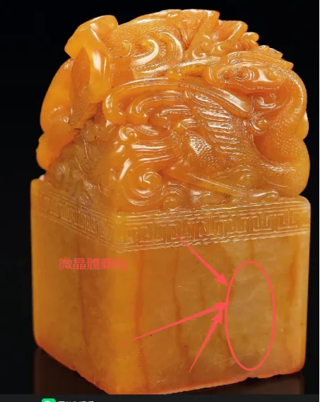虱卵紋又是怎麼形成的呢、根據我的推斷,虱卵紋應該是田黃石的原石在形成前,由於火山噴發時,由於岩漿溶液中有一種伴生礦的微晶體顆粒,夾雜在地開石和葉臘石溶液中、凝固在一起,但這種微晶體顆粒的硬度高於田黃石,當後來田黃石的原石被人們開採回後,通過雕琢加工成型,再經過打磨,拋光等工緒,這種象卵形一樣的微顆粒,由於它的硬度比田黃石稍硬,能以在拋光過程中,軟的田黃石被磨光後,這種卵形的微顆粒就在器錶夥露出來,田黃石通過長期把玩、撫摸、器物器錶會出現一種玻璃質感的包漿,象虱卵一樣的微顆粒就會一覽無餘的在器錶顯露出來,當你拿出田黃石作品迎光斜視時,這種象虱卵一樣的微顆粒就會象繁星一樣稀疏不一的在器身有不均勻分佈,而年代越久就越明顯。