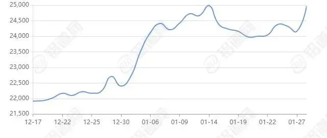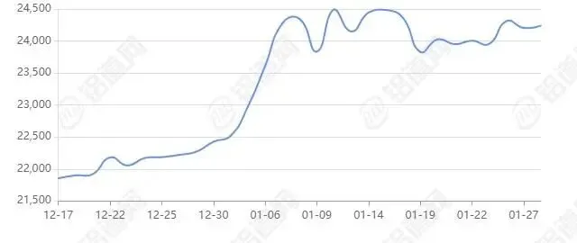 2026年01月28日上海期货行情价24240涨跌+70,最低24085,最高24500,前三日均价24156,前五日均价24085。