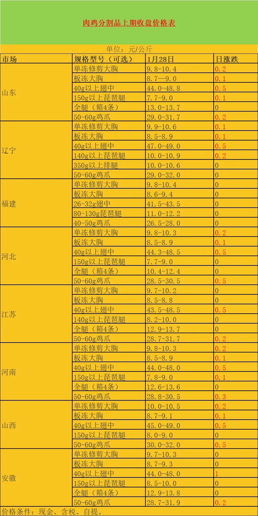 从今天的鸡肉分割产品成交来看,产品价格有稳有落,其中板冻大胸价格在8200-9500元/吨,单冻大胸价格在9600-10300元/吨,大琵琶腿价格在7000-11000元/吨,排腿价格在9600-12500元/吨,大翅中价格在41200-48500元/吨,大翅根价格在10600-11500元/吨,爪类价格价差较大,中爪袋装价格24400-28500元/吨,箱装多以质论价。