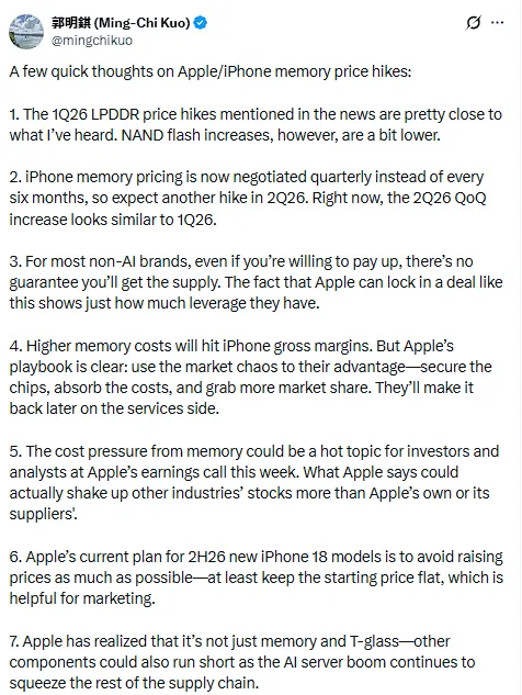 1月28日,“最懂苹果的分析师”郭明錤在社交平台X上发帖称,苹果能够在供应紧张环境下锁定内存供应协议,充分展现其强大的议价能力。