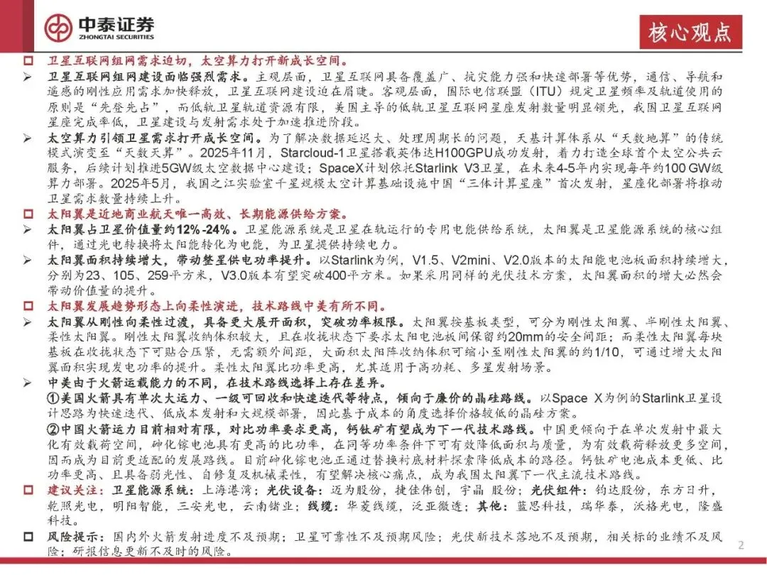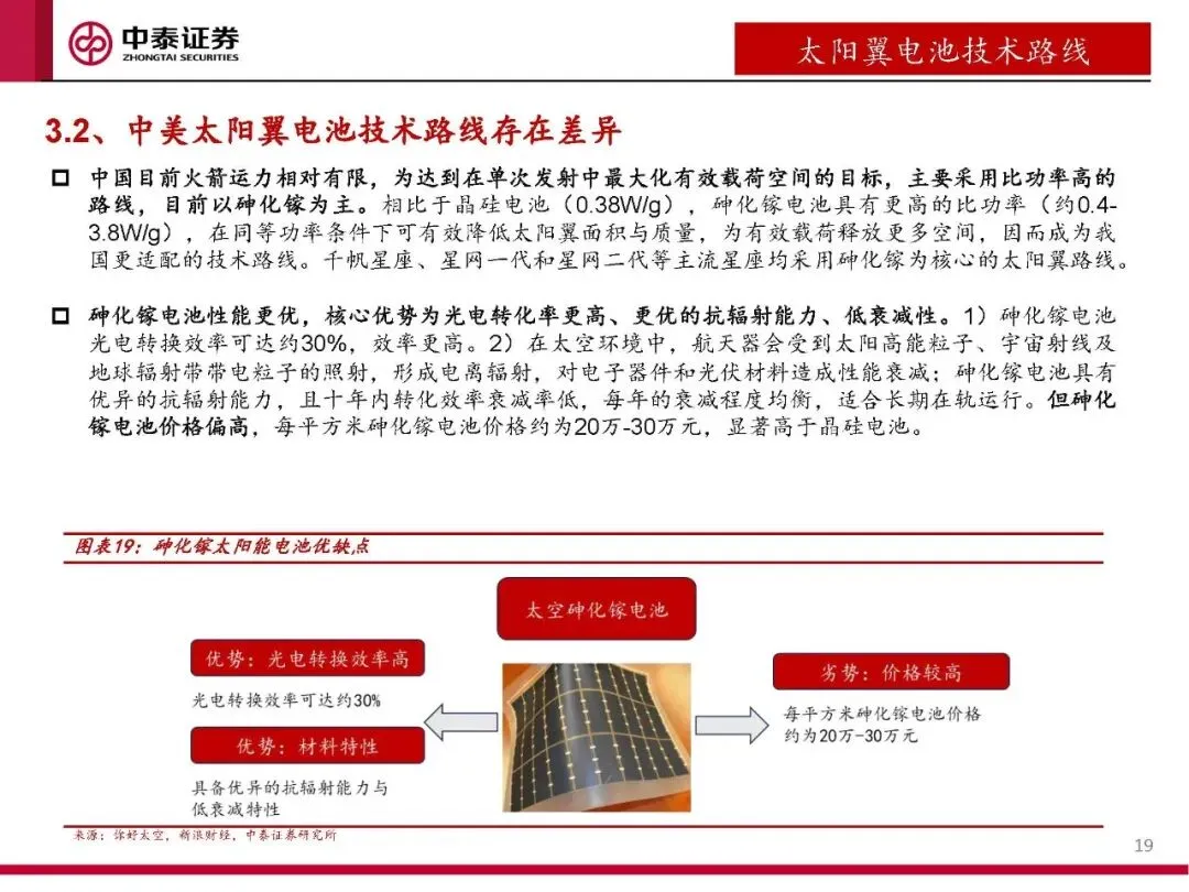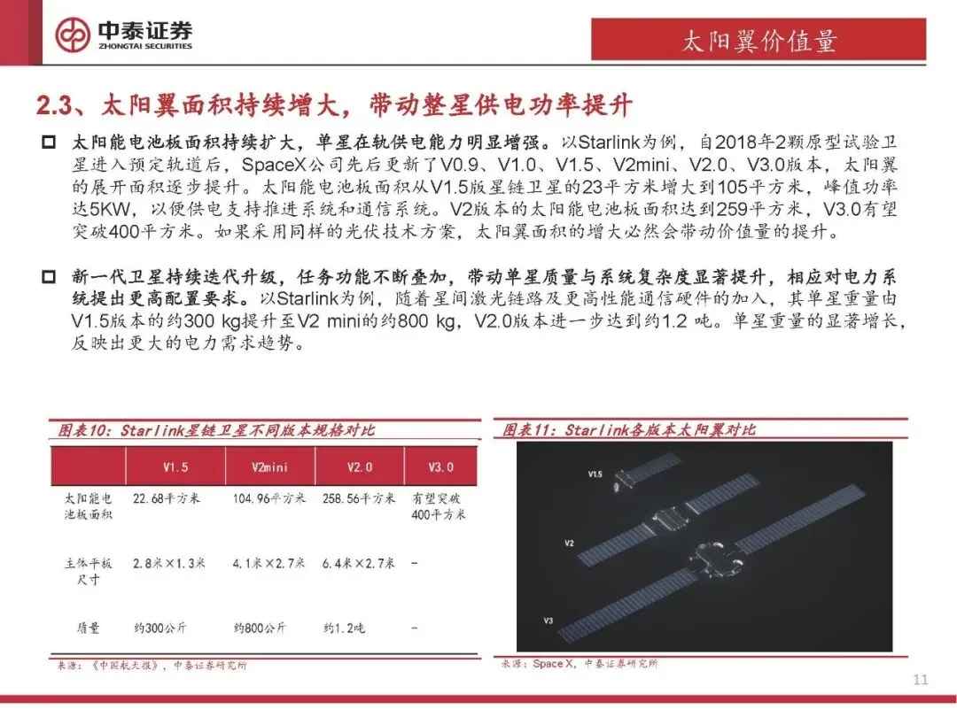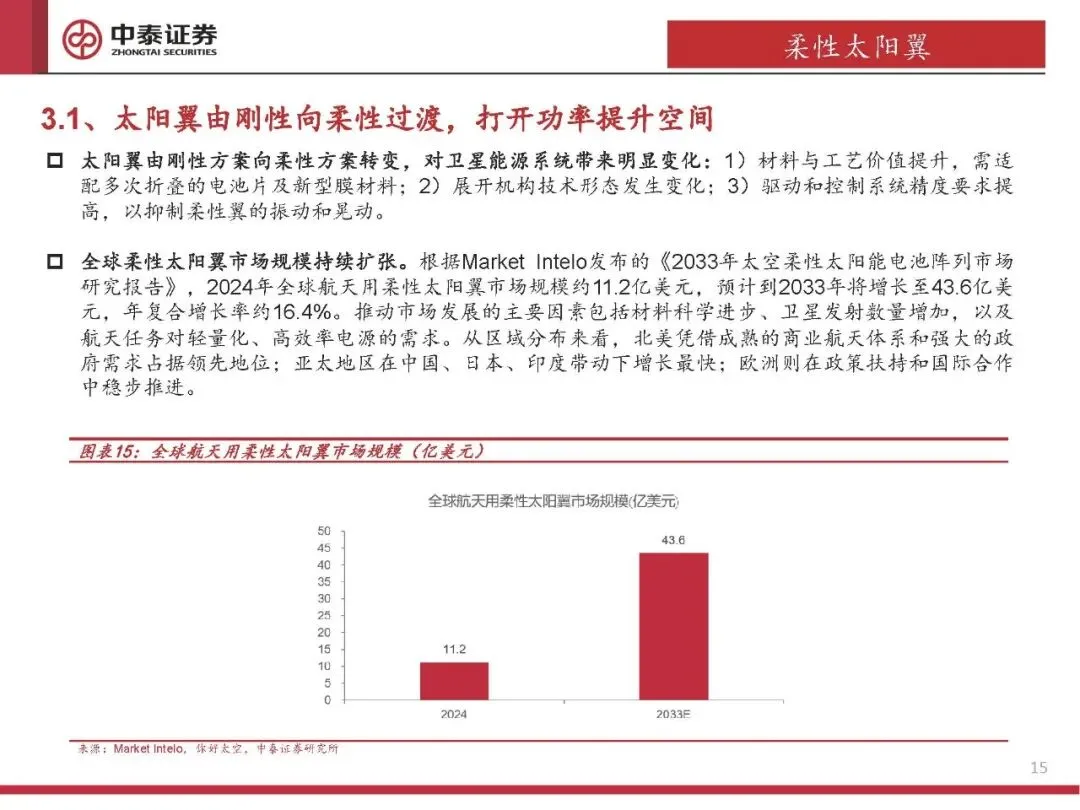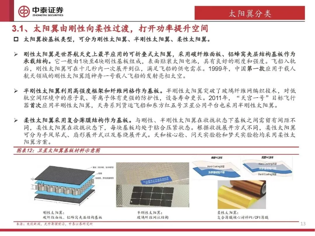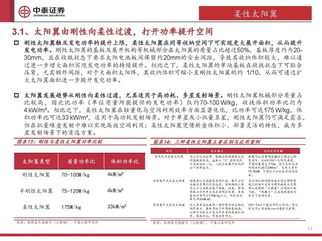 太阳翼从刚性向柔性过渡,具备更大展开面积,突破功率极限。柔性太阳翼比功率更高,尤其适用于高功耗、多星发射场景。