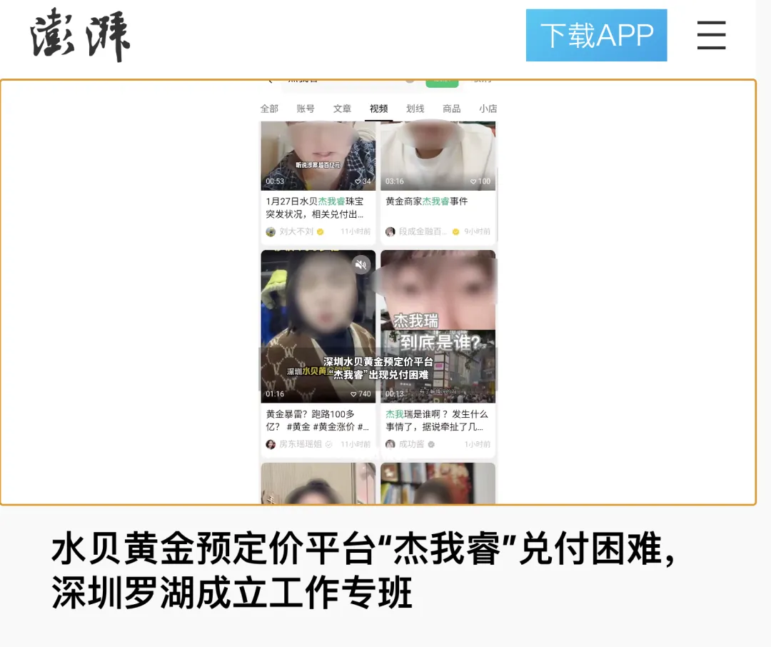 据新闻媒体报道,近日,杰我睿名下的“杰我睿珠宝”及多个关联的线上平台 “龙冶金”“金城金世界”,均出现了兑付困难,波及众多投资者。