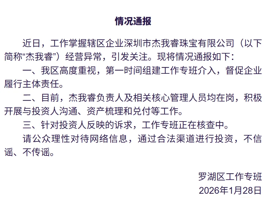 近日,工作掌握辖区企业深圳市杰我睿珠宝有限公司(以下简称“杰我睿”)经营异常,引发关注。现将情况通报如下: