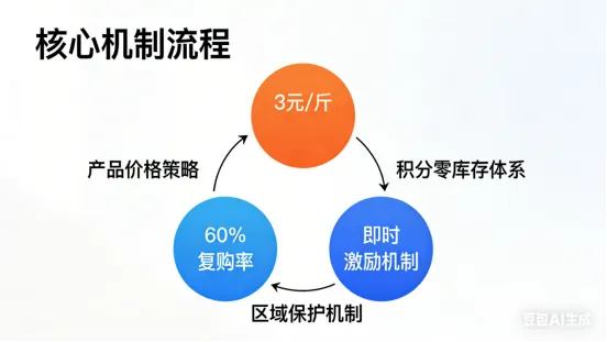 1.产品价格策略:3元/斤的高性价比引流品(SGS认证加持),搭配60%复购率的复购价,兼顾拉新与留存。