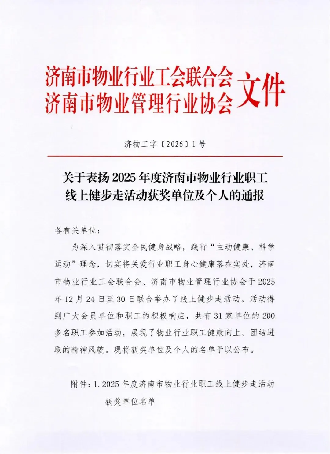 关于表扬2025年度济南市物业行业职工线上健步走活动获奖单位及个人的通报