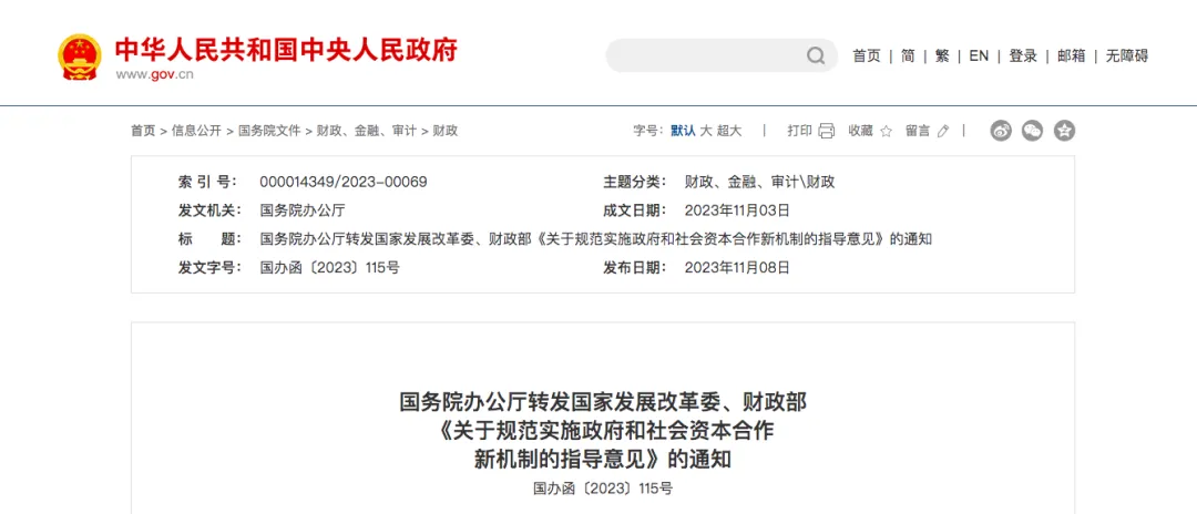 11月8日,国家发展改革委会同有关方面研究起草了《关于规范实施政府和社会资本合作新机制的指导意见》(以下简称《意见》),由国务院办公厅转发各地方、各部门贯彻落实。《意见》从准确把握新机制的总体要求、规范推进建设实施、切实加强运营监管、加大政策保障力度等方面,规范实施政府和社会资本合作(PPP)新机制,拓宽民间投资空间,坚决遏制新增地方政府隐性债务。👉🏻点击查看更多(国务院办公厅)