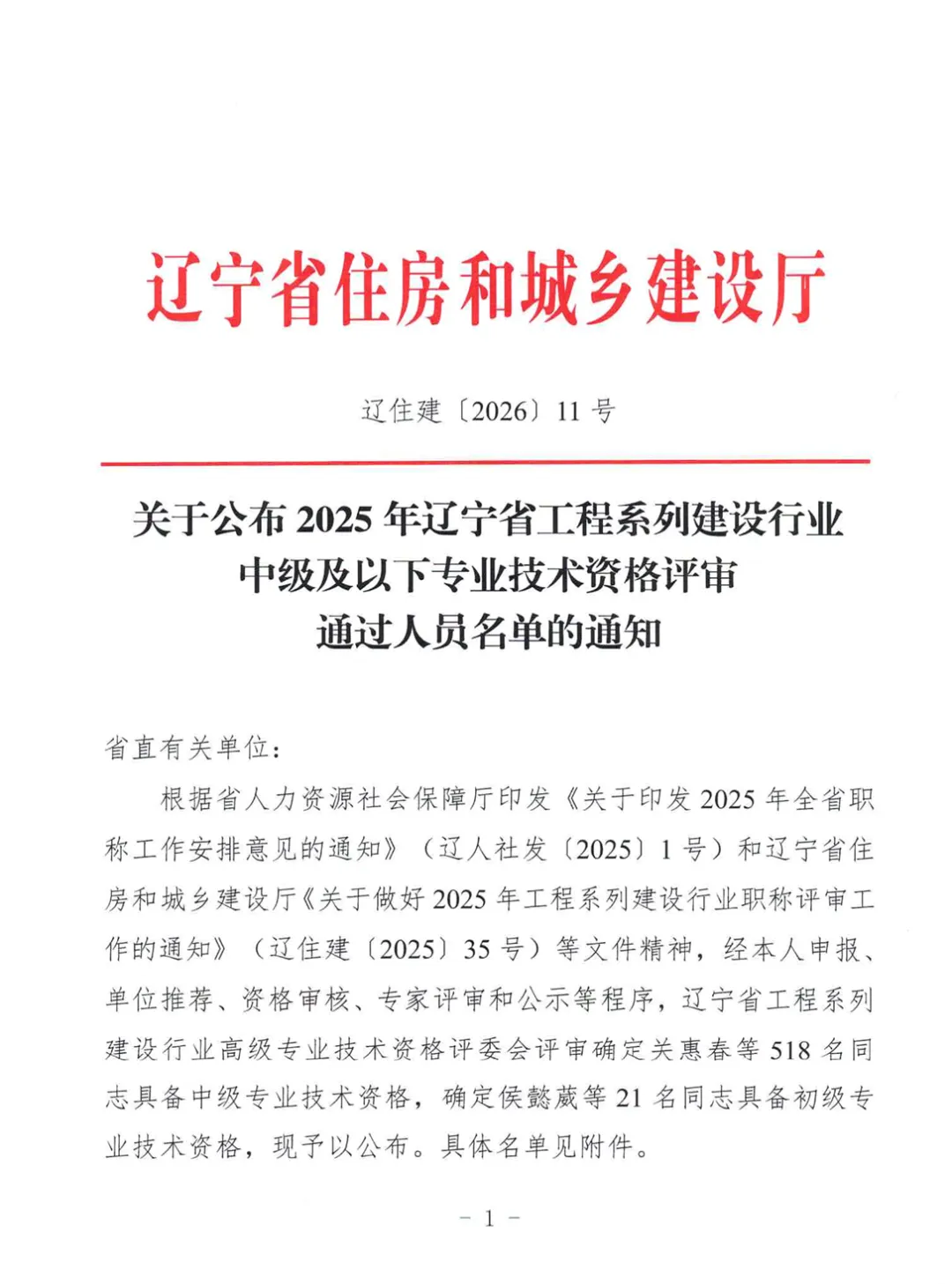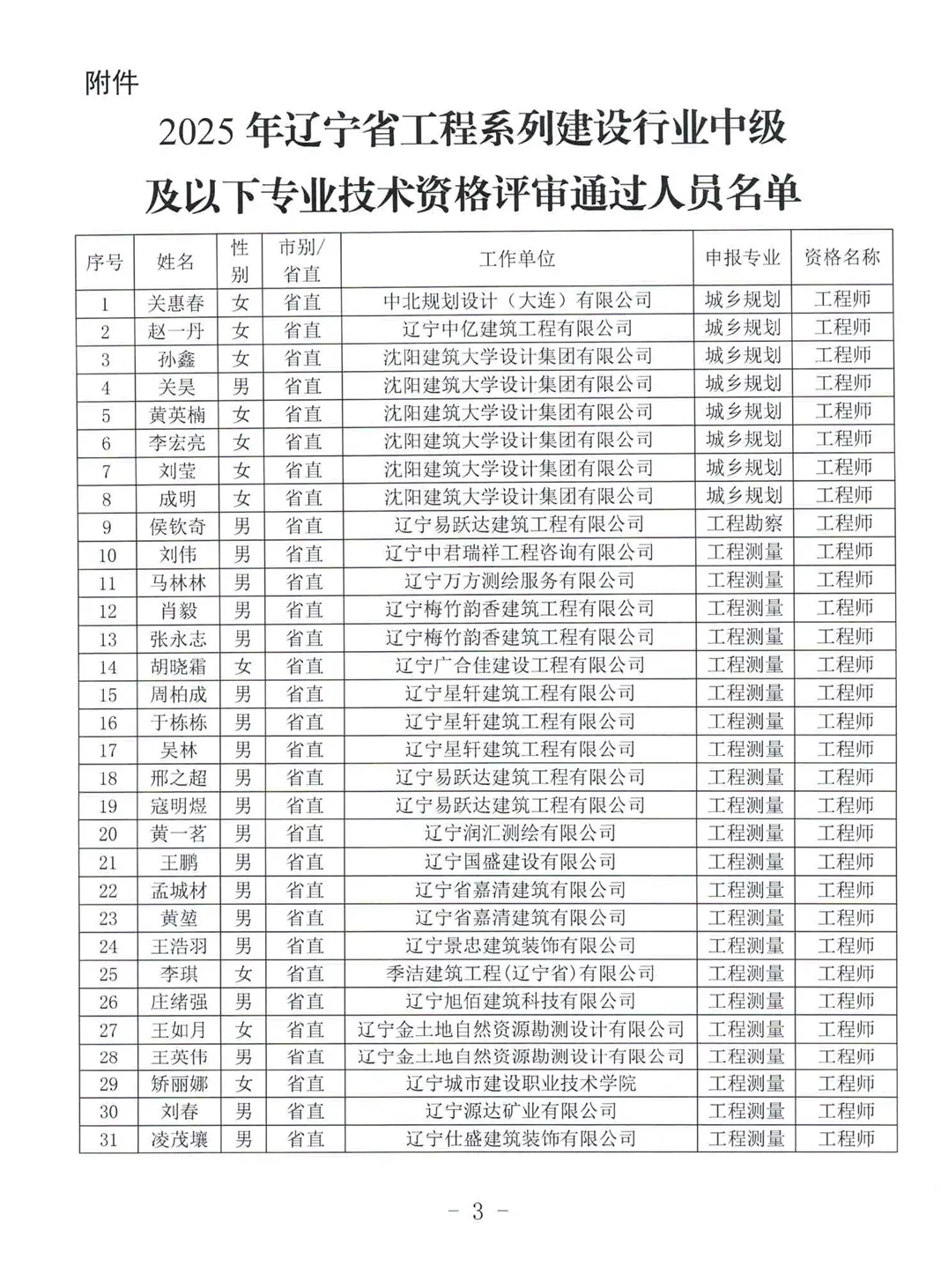 >关于公布2025年辽宁省工程系列建设行业中级及以下专业技术资格评审通过人员名单的通知
