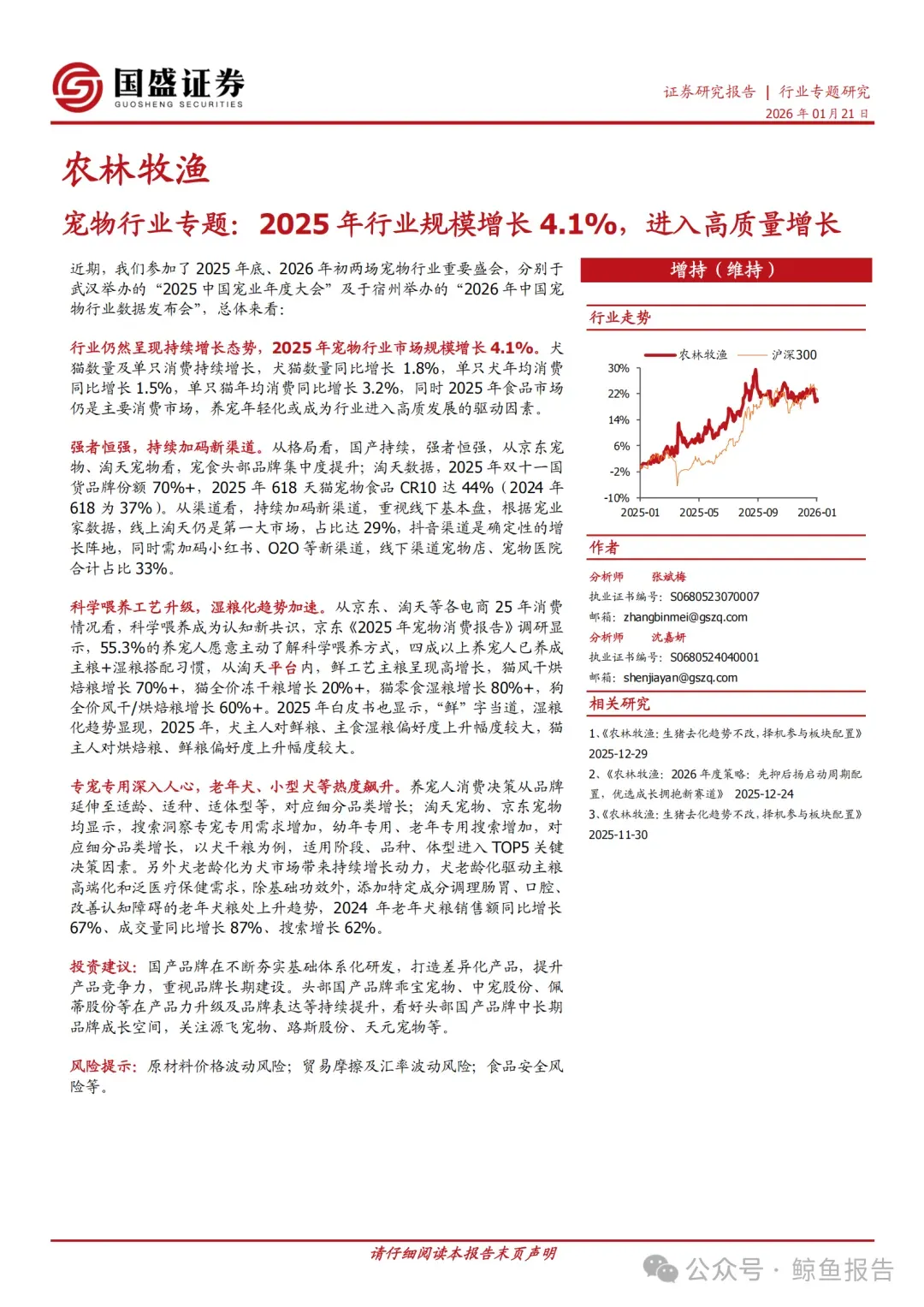 行业仍然呈现持续增长态势,2025年宠物行业市场规模增长4.1%。犬猫数量及单只消费持续增长,犬猫数量同比增长1.8%,单只犬年均消费同比增长1.5%,单只猫年均消费同比增长3.2%,同时2025年食品市场仍是主要消费市场,养宠年轻化或成为行业进入高质发展的驱动因素。