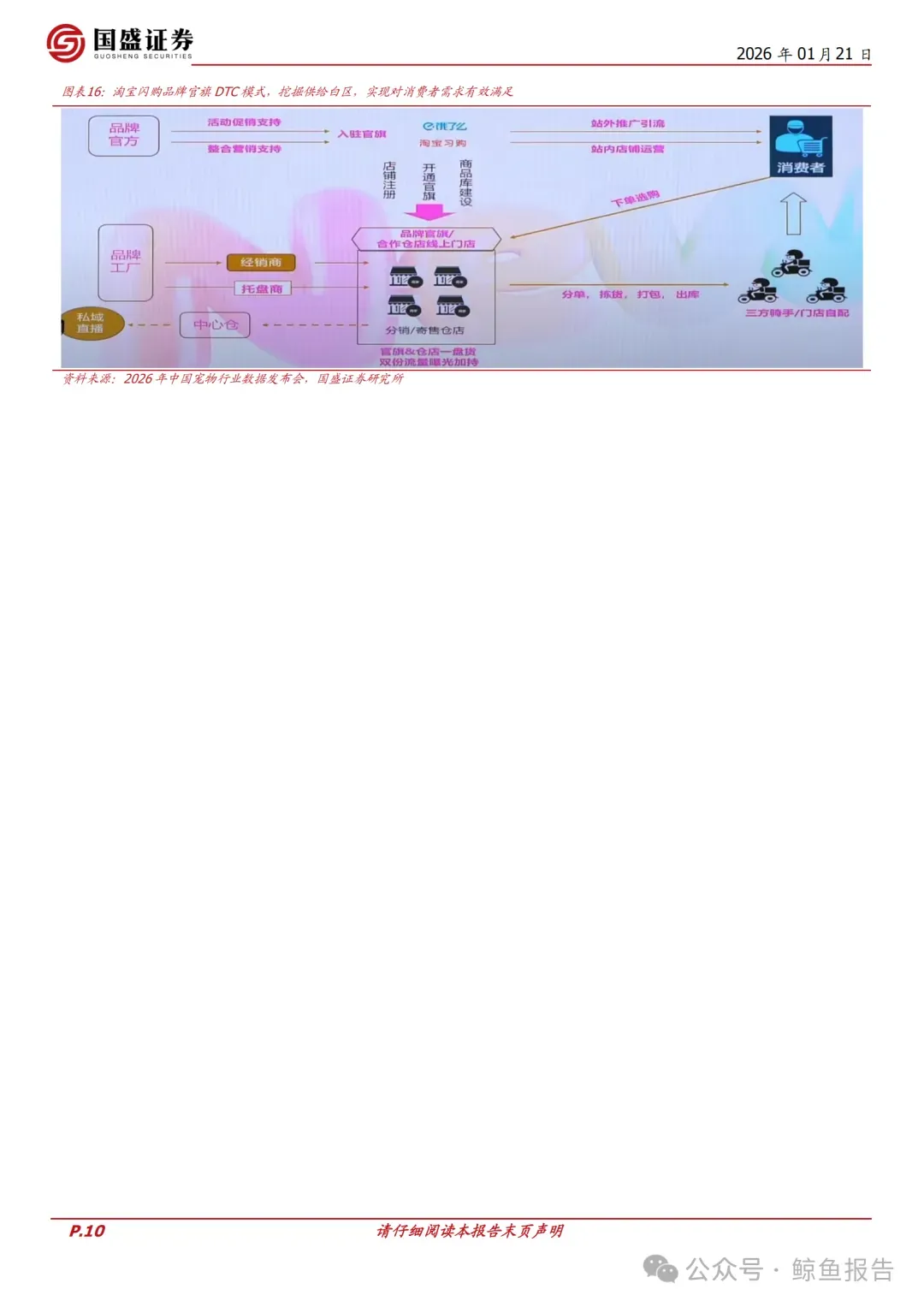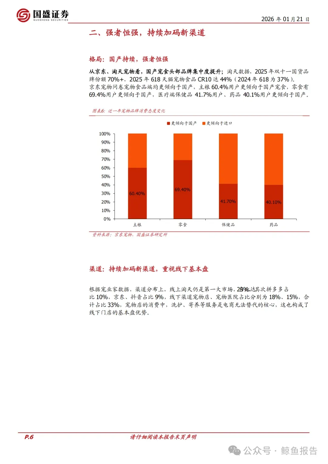 强者恒强,持续加码新渠道。从格局看,国产持续,强者恒强,从京东宠物、淘天宠物看,宠食头部品牌集中度提升;淘天数据,2025年双十一国货品牌份额70%+,2025年618天猫宠物食品CR10达44%(2024年618为37%)。从渠道看,持续加码新渠道,重视线下基本盘,根据宠业家数据,线上淘天仍是第一大市场,占比达29%,抖音渠道是确定性的增长阵地,同时需加码小红书、O2O等新渠道,线下渠道宠物店、宠物医院合计占比33%。