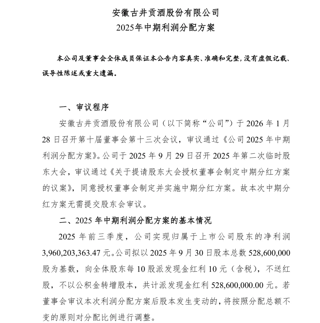 1月28日,古井贡酒发布《2025年中期利润分配方案》显示,古井贡酒拟以2025年9月30日股本总数528,600,000股为基数,向全体股东每10股派发现金红利10元(含税),不送红股,不以公积金转增股本,共计派发现金红利5.29亿元。