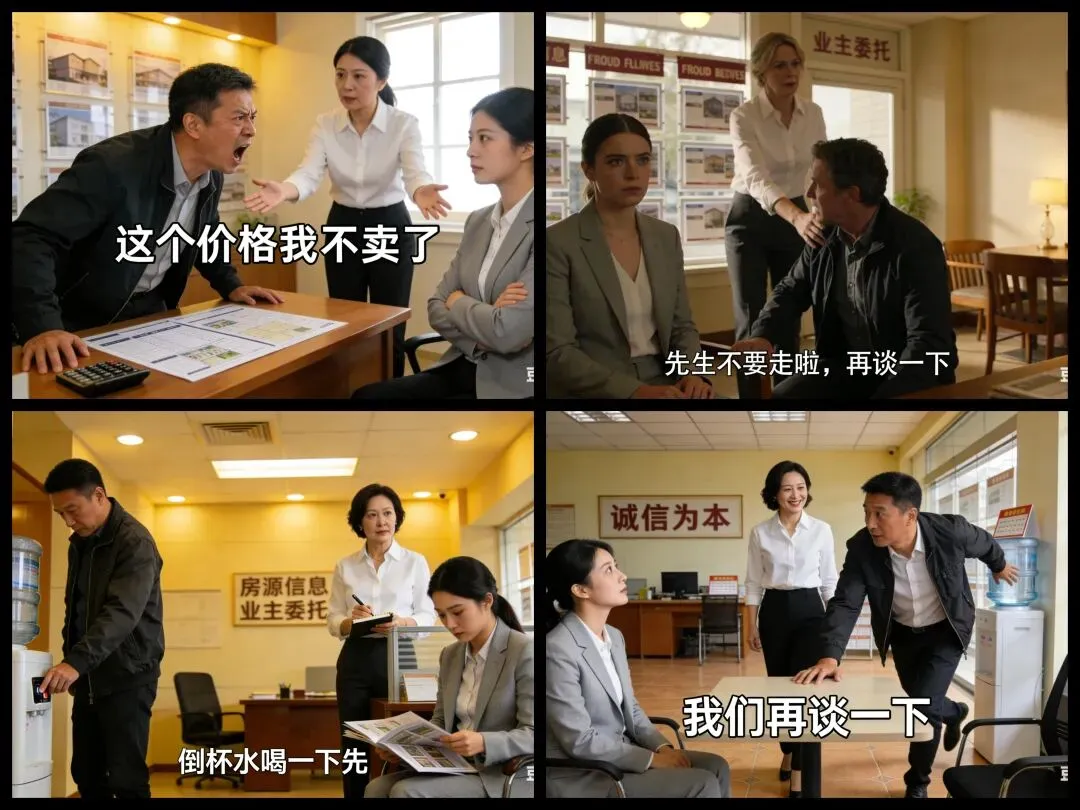就我公司所经手的二手或者其他中介朋友获得的信息,现在的确有个别屋主态度开始“硬”起来。但愿意过来中介门店摆台谈价的,大多只是“口硬心软”,正如下面这个连环画讲述的。业主面对买家一开口就大刀砍价,先是装着起身要走,情绪激动的说:我不卖了,自己留着。但看买家口风没什么松动,业主自己走去喝杯水,又坐回来,还是再谈谈吧。