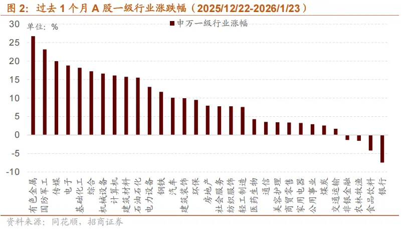 过去一个月(2025/12/22-2026/1/23),市场总体小幅震荡上行,沪深300和上证指数分别录得2.94%、6.32%的涨跌幅;市场轮动较快,其中有色金属、国防军工、传媒、电子、基础化工等涨幅领先;机械设备、计算机、建筑材料、石油石化等板块也有不同程度上涨;银行回调显著,指数跌幅达7.46%,食品饮料、农林牧渔、非银金融等板块均有不同程度回调,具体行情可以分为三段: