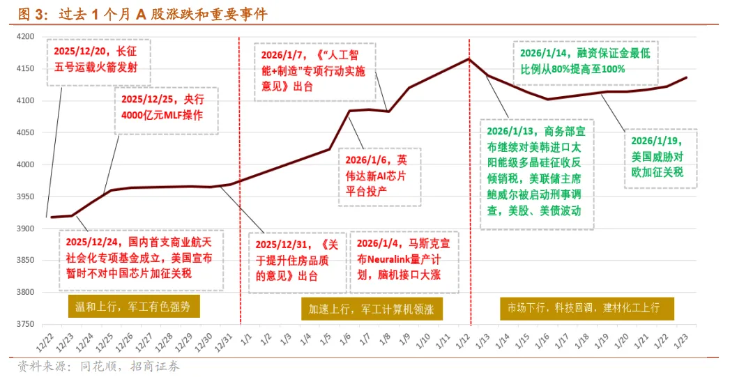 ⚑ 市场表现复盘:过去一个月市场总体小幅震荡上行。12月下旬至月底,市场温和上行,长征五号运载火箭发射点燃商业航天市场热情,金、铜等价格强势,国防军工及有色板块领涨。1月中上旬,市场持续上行,CES 2026拉开帷幕,产业趋势和事件催化密集落地,传媒、国防军工、计算机等科技成长板块领涨。1月中下旬,监管上调融资比例,市场降温,主线先后退潮,前期涨幅较高板块普遍回调,顺周期板块表现较好。