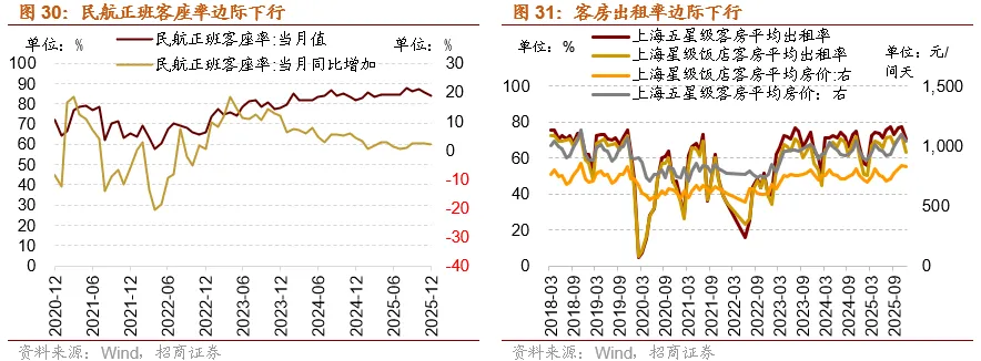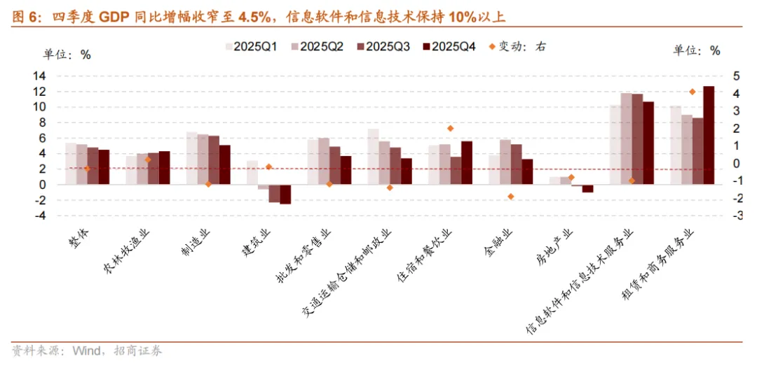 2025年GDP累计增速5.0%,受基数和政策节奏影响,单季度增速前高后低,增速逐季收窄。细分行业显示新旧动能持续分化。信息软件和信息技术服务保持10%以上增速;其次制造业GDP保持5%以上增速,但增幅有所放缓;房地产和建筑业受地产和投资需求偏弱影响,GDP增速处于较低水平,四季度降幅进一步扩大至-1.0%和-2.5%。但四季度增速有所改善的领域主要集中在农林牧渔、住宿和餐饮、租赁和商务服务等消费领域。