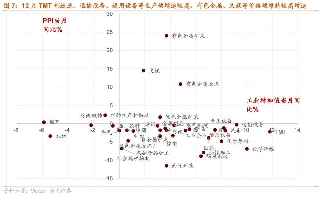 大众消费品领域中,茅台推行价格市场化改革,酒企步入业绩快速出清阶段,未来随着头部酒企控量稳价,在促消费政策催化下,需求有望弱复苏带动整体动销改善;12月粮油食品、饮料、服装鞋帽针纺织品零售额同比增幅均收窄,后续需求有望受春节备货旺季驱动。