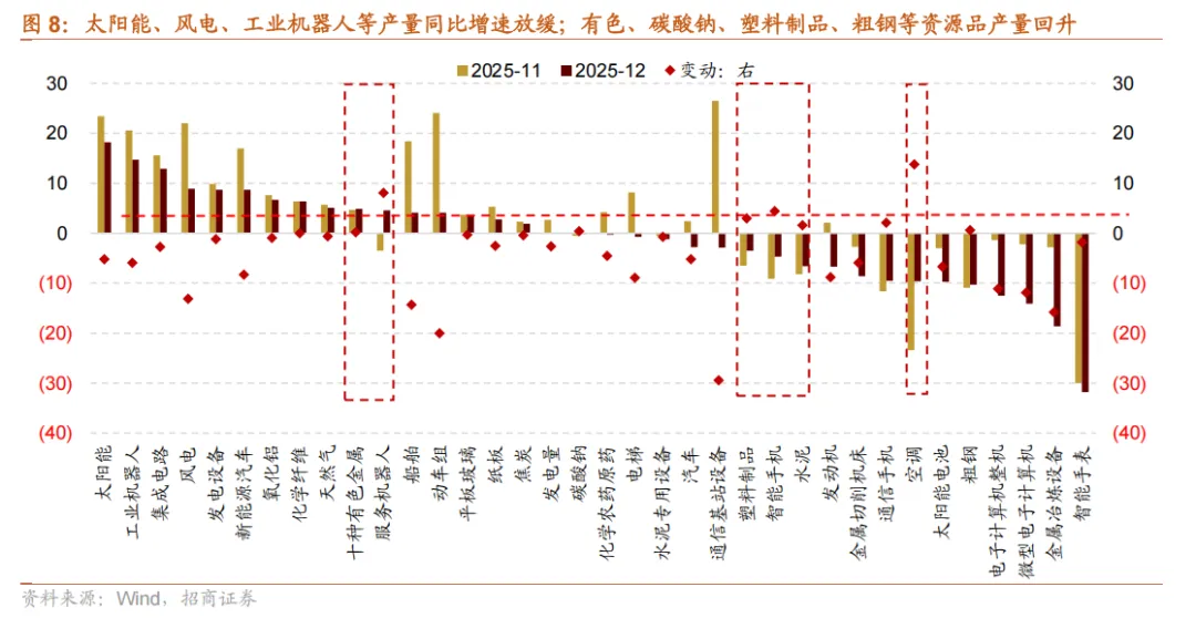 反内卷背景下主要产品产量增速部分放缓,典型的如太阳能、工业机器人、集成电路、风电、发电设备、新能源汽车、汽车、金属切削机床、太阳能电池等产量增速放缓;仅部分资源品随着价格的上涨,生产端增速回升,如有色金属、碳酸钠、塑料制品、粗钢等。
