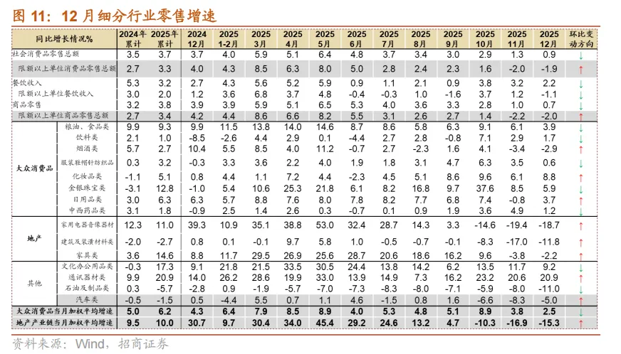 12月社会消费品零售总额当月同比增幅进一步收窄,消费需求仍然不足,化妆品、金银珠宝、通讯器材类需求相对景气。