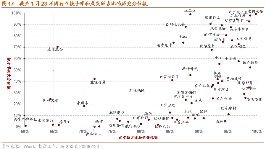 交易集中度:近期市场成交情况分化明显,从不同行业换手率历史分位数和成交额占比来看,电网设备、军工电子、航空装备、工业金属、汽车零部件、发电设备、通用设备、半导体等等领域交易占比相对较低。