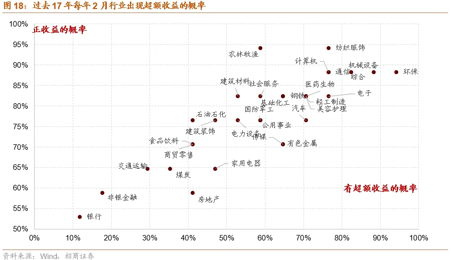由于每年例如业绩预告、两会、政治局会议、业绩考核等等具有季节性效应,每个月的行业有一定的季节性,也可以作为行业选择的参考。每年2,相对较高概率出现超额收益的行业主要集中在机械设备、通信、电子、医药生物、计算机等偏成长领域和美容护理、纺织服饰、农林牧渔等消费领域。