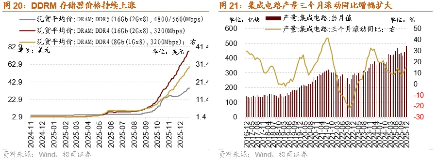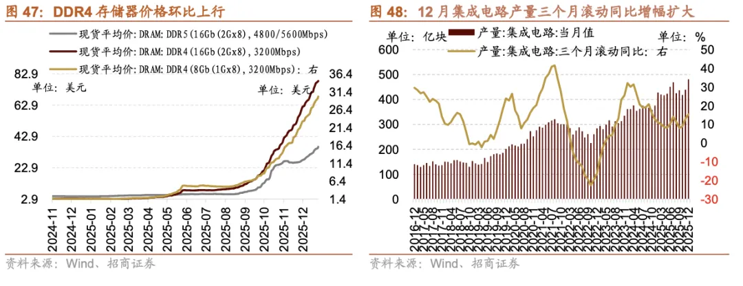 电子(半导体):AI需求拉动半导体销售额高速增长,存储器供不应求价格持续强势,国产替代进程加速。1)AI算力和存力需求旺盛,推动半导体销售额实现高速增长,2025年11月全球半导体销售额同比增幅扩大。2)受益于AI算力需求爆发与HBM挤占传统DRAM和NAND Flash产能,供需关系不平衡推动存储器价格持续上涨。截至1月23日,16GB、8GB DDR4价格月环比分别上涨35.5%和41.1%,16GB DDR5价格月环比上涨37.0%。3)供需两端发力,存储领域国产化不断提速。国内存储厂商积极扩产,同步加强高端存储研发投入;同时国产存储器件在终端厂商采购中的占比不断提升。4)先进制程领域国内扩产可期,国内先进制程产线扩产进展有望在2026年提速,同时成熟制程预计将保持稳健扩产节奏,新增产能主要来自地方政府等产线建设项目。5)量价齐升,近期台积电业绩和资本开支均超市场预期,预计行业2025年年报以及2026年一季报盈利有望延续高增。